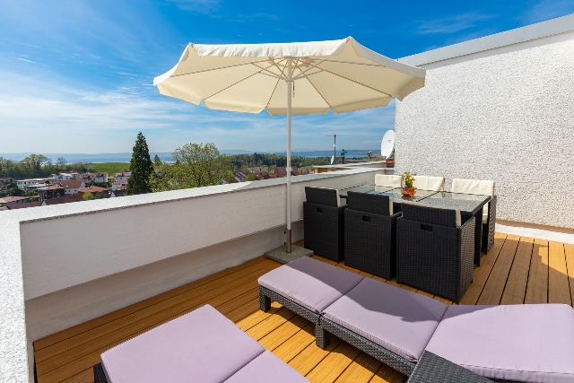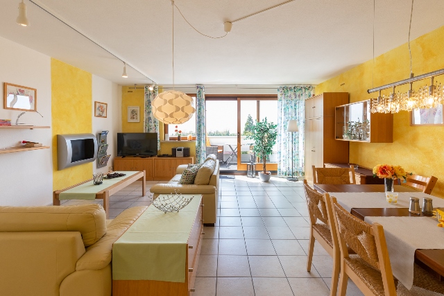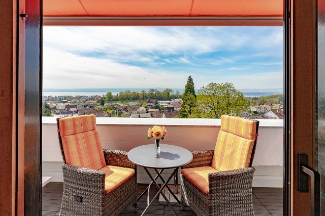 Das helle Wohn - und Esszimmer hat einen Balkon mit Blick auf den See, nach Konstanz und die Insel Mainau. Die Wohnung hat Fußbodenheizung und einen Kamin, es stehen Bücher und Spiele zur Verfügung.