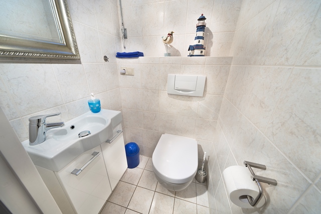 Das Badezimmer hat 2 Waschbecken, Dusche, Waschmaschine und ein separates WC.