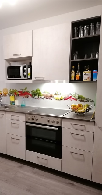 Die neue Küche ist voll ausgestattet mit Herd, Backofen, Spülmaschine, Mikrowelle, Wasserkocher, Kaffeemaschine.